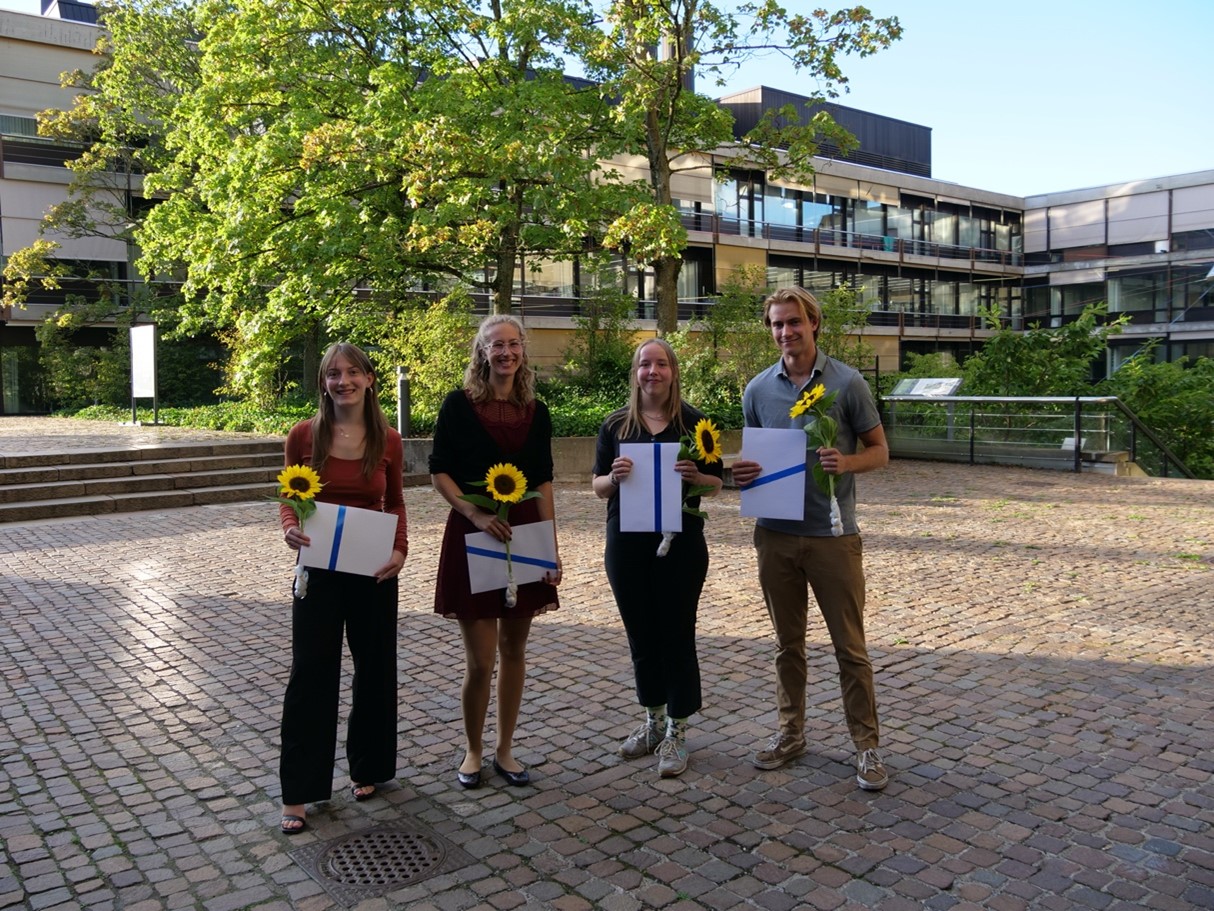 Gruppenbild mit den diesjährigen Preisträger:innen (v.l.n.r.): Sabeth Sturm, Amélie Schneider, Annika Strässler, Jan Boison. Nicht im Bild: Clara Henricsson (Auslandaufenthalt), Luis Tschigg (Rekrutenschule)